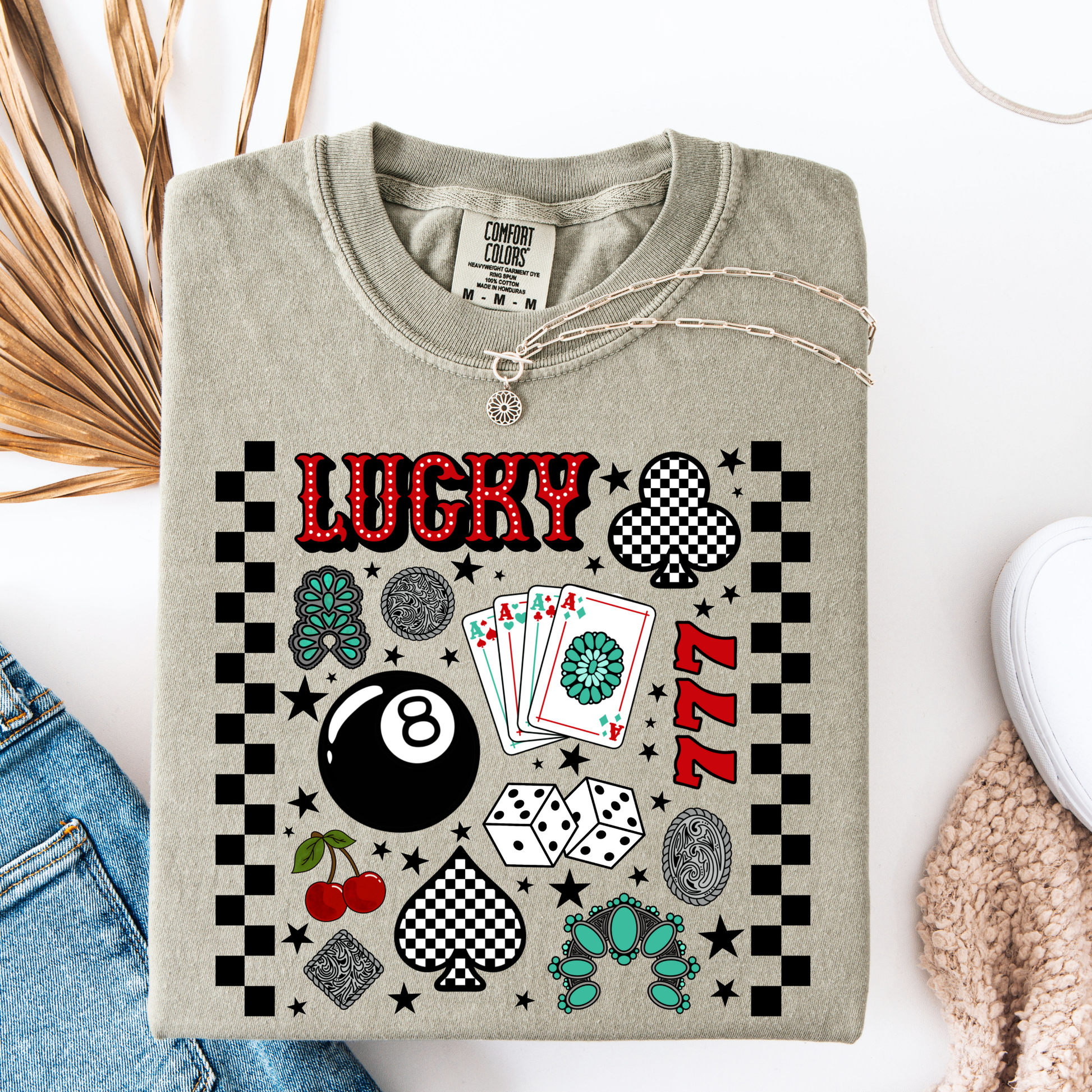 Bring a burst of good fortune to your look with the Lucky 7 Collage Graphic Tee. This playful design mixes iconic lucky symbols in a vibrant collage, making it a fun and eye-catching choice for everyday wear. Perfect for those who love a bit of whimsy and charm in their style.