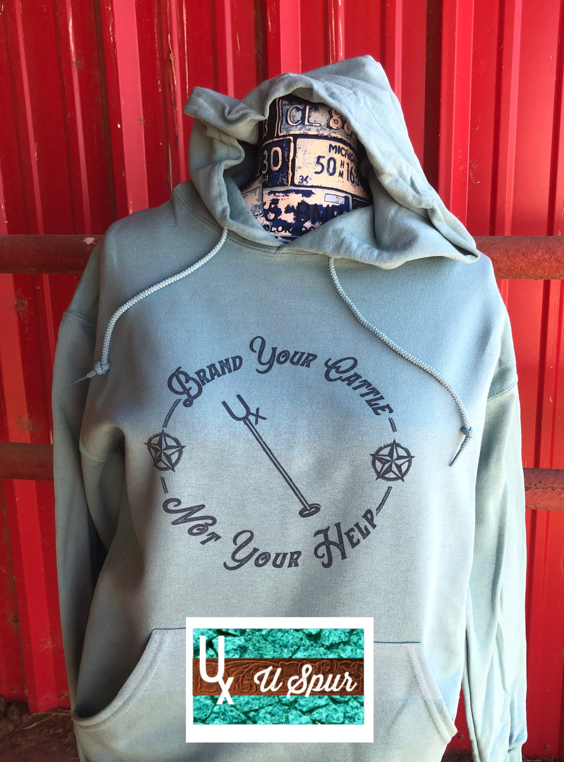 Black print on sage super soft hoodie with front pocket, unisex sizing