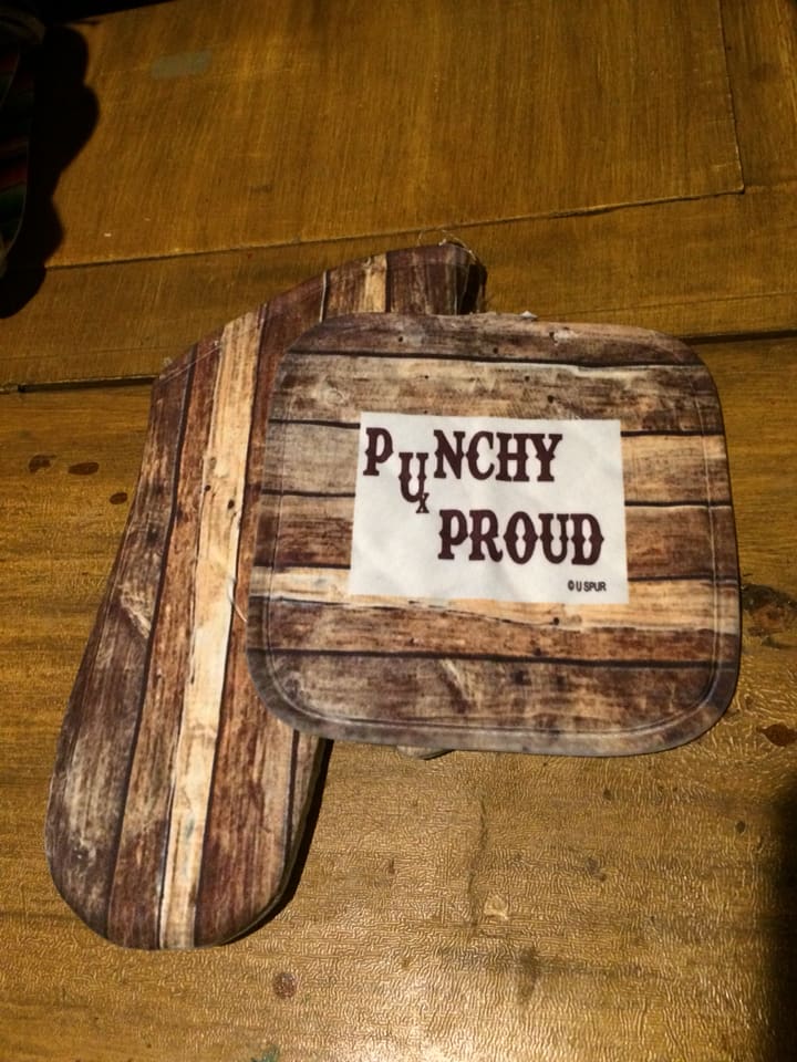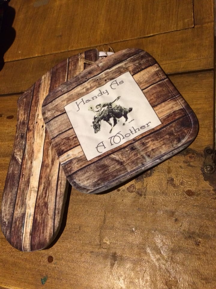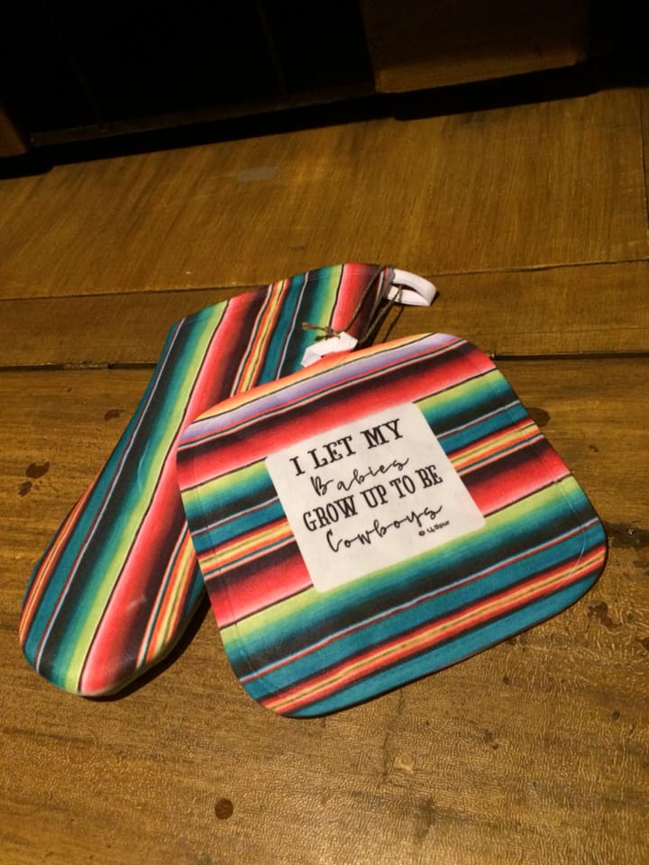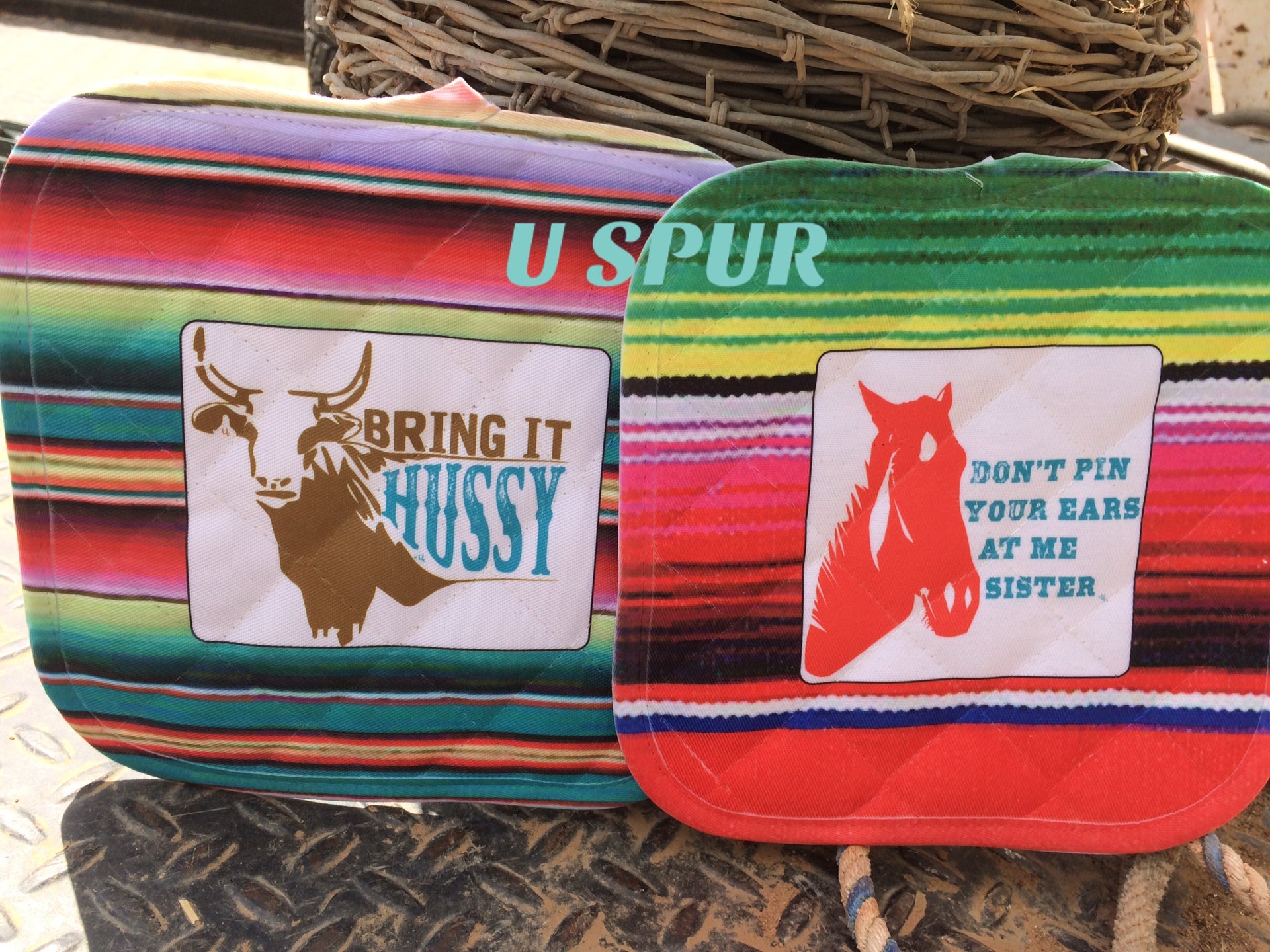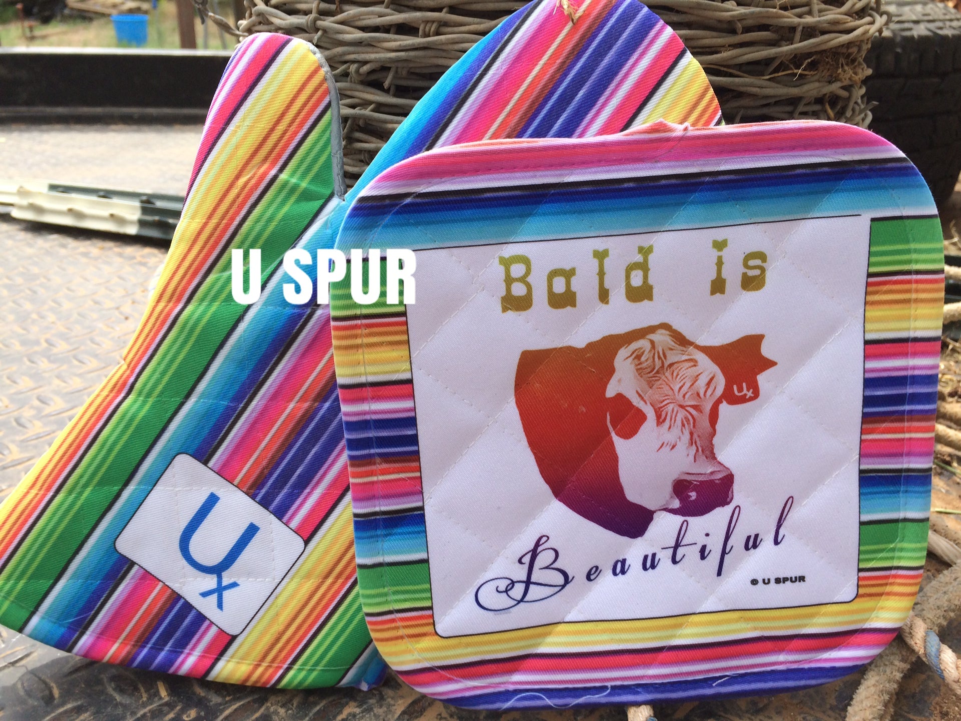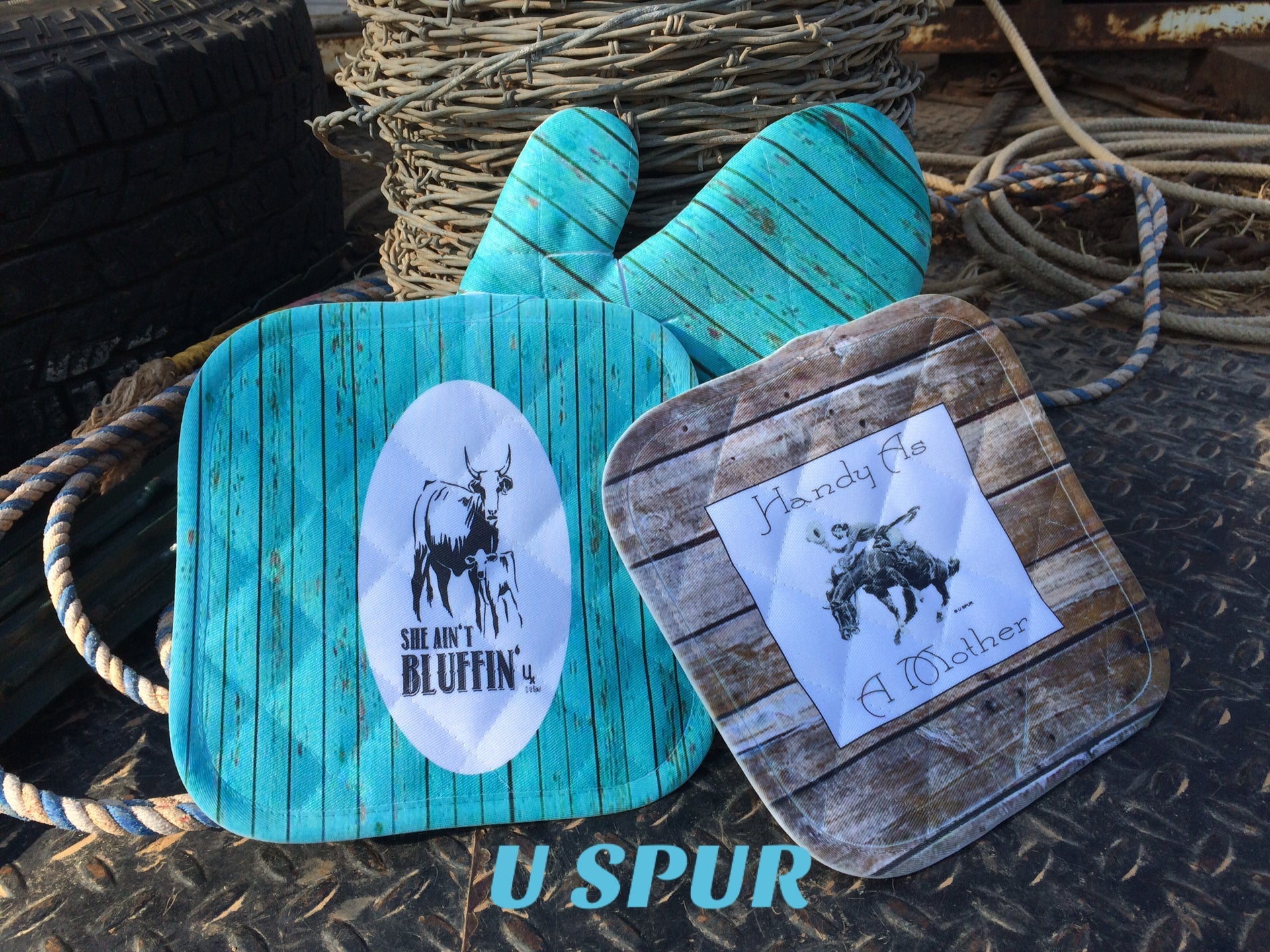 U Spur original design hot pad and oven mitt sets. Each hot pad comes with the coordinated oven mitt. The colors are very bright and the quality is great!