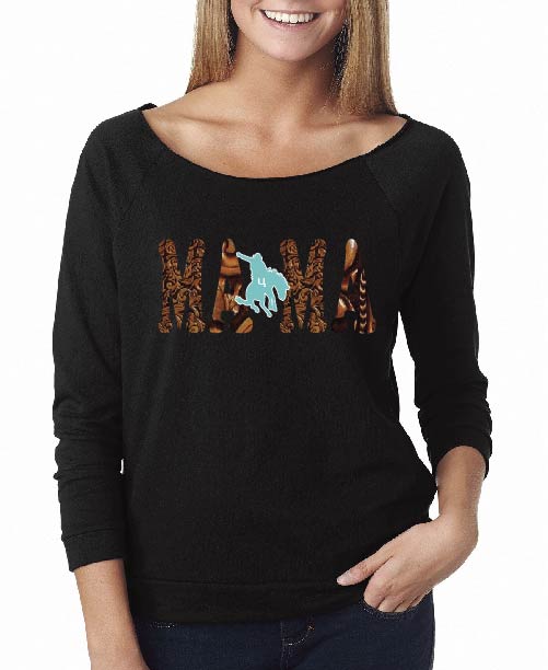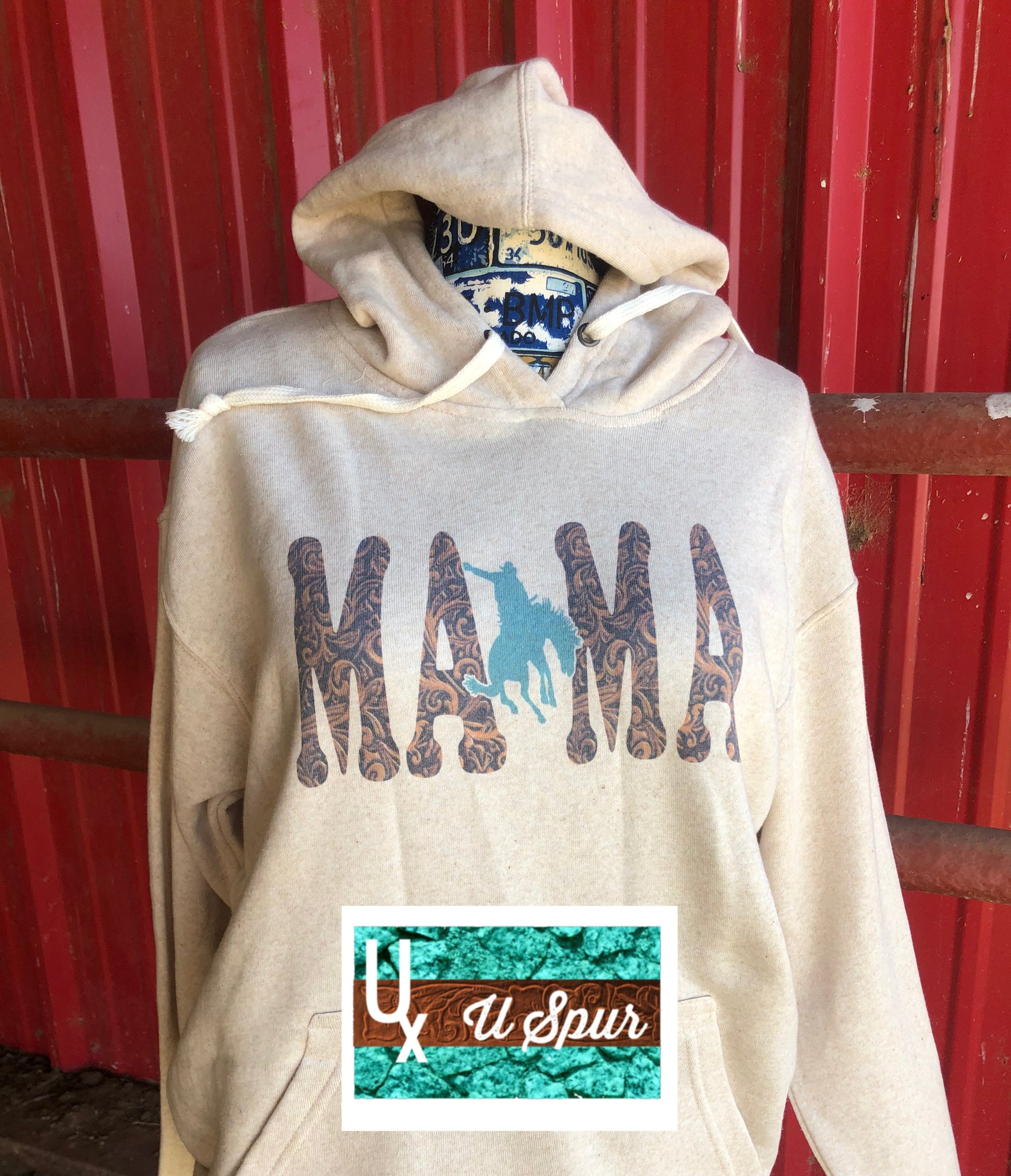 Mama in tooled leather print with turquoise bronc on oatmeal hoodie, unisex sizing