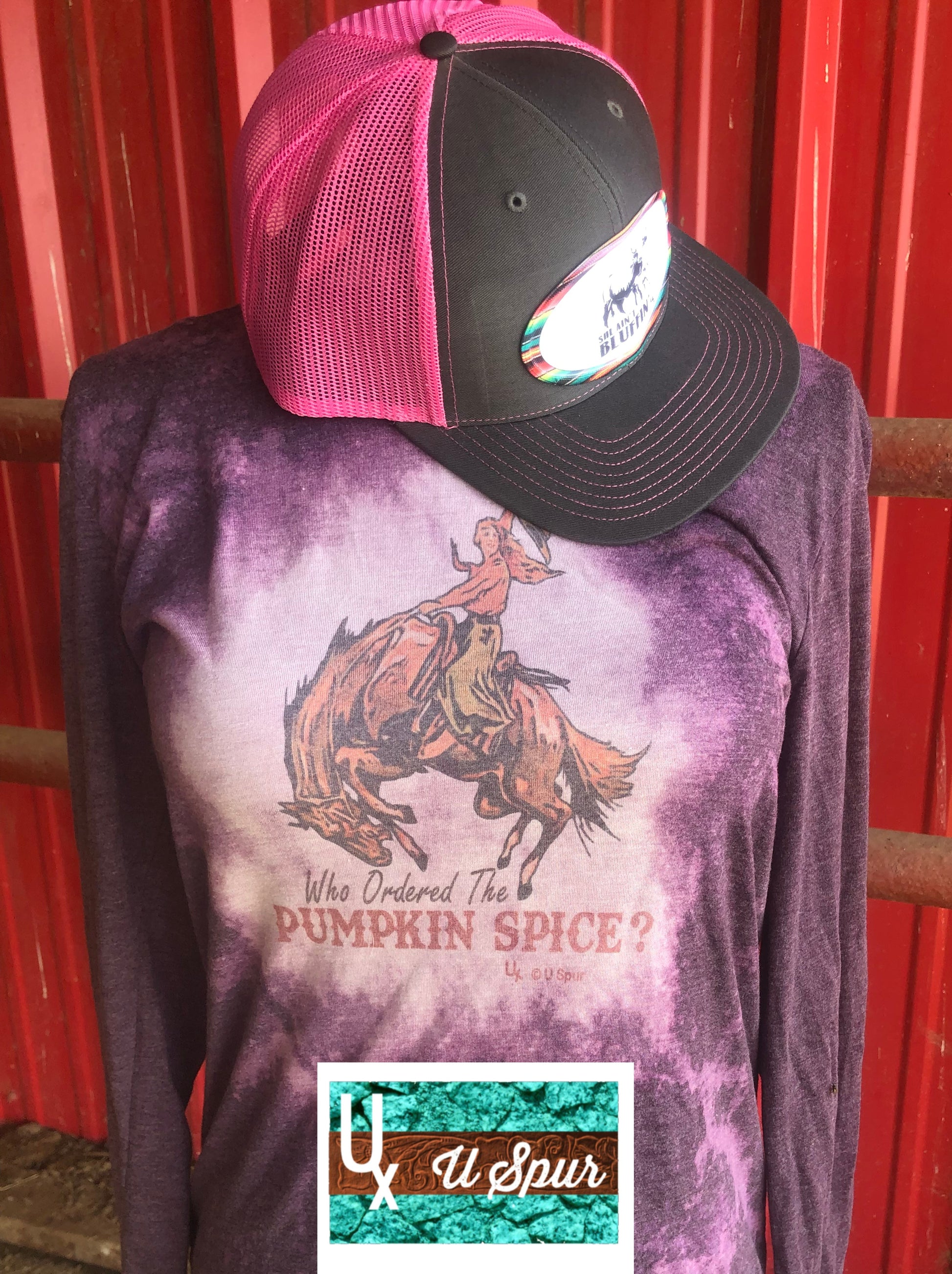 Bleached Next Level long sleeve vintage purple tee with our spiciest pumpkin ginger gal!