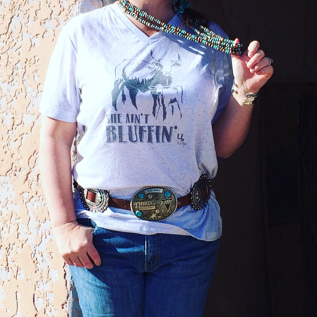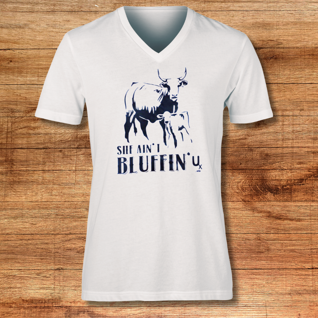 U Spur original design, but let's face it, we ALL know this cow! Gunmetal Gray screenprint on white fleck Bella v neck tee.