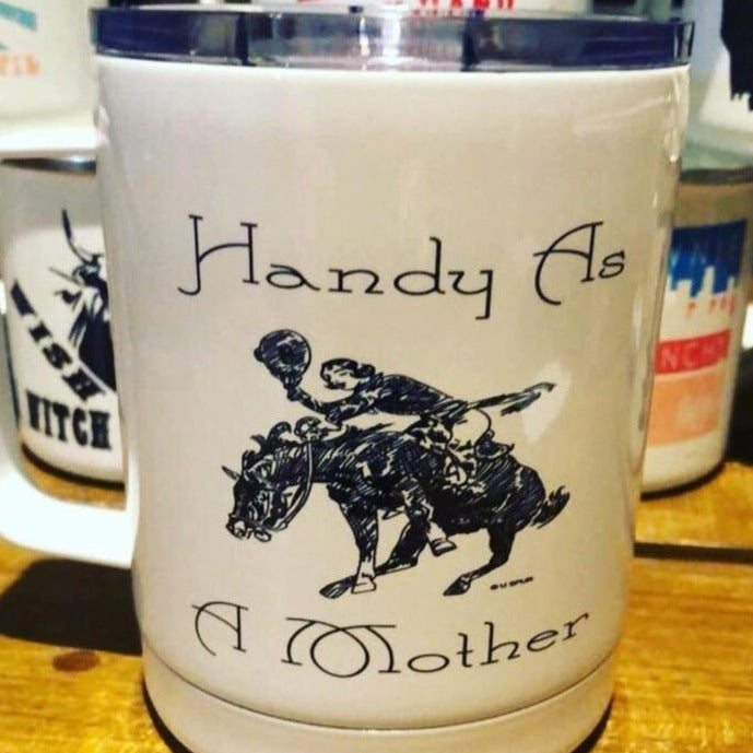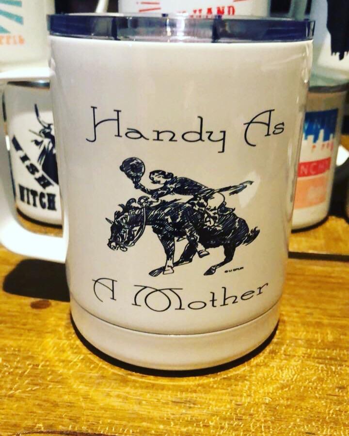 U Spur original travel mugs. All of our awesome ranch graphics available on the 15 oz stainless enamel travel mug with lid. Often imitated, never duplicated.